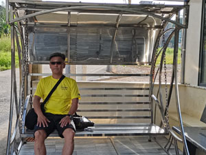 ホテル入口のブランコに乗って、 ダイビングショップのお迎えを 待つTom。