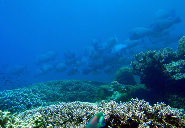 ギンガメアジの大群、アカモンガラ、ウミズキチョウチョウウオ、シマハタタテダイ、