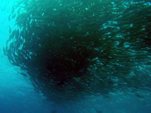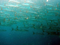 ロクセンヤッコ、チンアナゴ、モンガラカワハギ、バラクーダの群れ、アミメフウダイ、