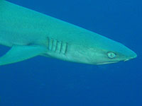 ホワイトチップシャーク、カスミアジ、ツノハタタテダイ、カンムリブダイの群れ