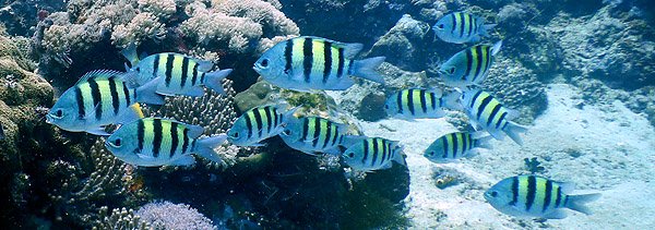 ハマクマノミ、デバスズメダイ、フエフキダイ、チョウチョウウオ、モンハナシャコ、カスミチョウチョウウオ、