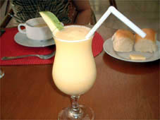 ところで、おみやげなんて別に買わなくてもいいし、 | 無理に買うものではないと思うのだが、町に出て何かしら、 買い物をしないと旅行気分が出ない。 変なものだ。 そこで今日は、セブシティに出てシューマートで買い物、 ついでに何かウマイ物を食べて来ようということになった。 しかし、もうすでに1時を過ぎ、おなかも空いていることと、 ホテルのお昼のチケットが残っていることから、 ホテルの食事を軽くこなしてから、出発する事にした。 飲み物は、角さんオススメの『グリーンマンゴシェーク』。 |
