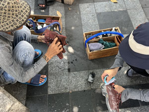 ここに座ってと、 | 中ば無理やり 靴を脱がされ ゴムが剥がれてると言い 瞬間接着剤で貼り始めた。