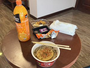 ホテルから戻ると、 最後の片付けをし出発した。 そして 軽く夕食。 (持参した食料減らし) |